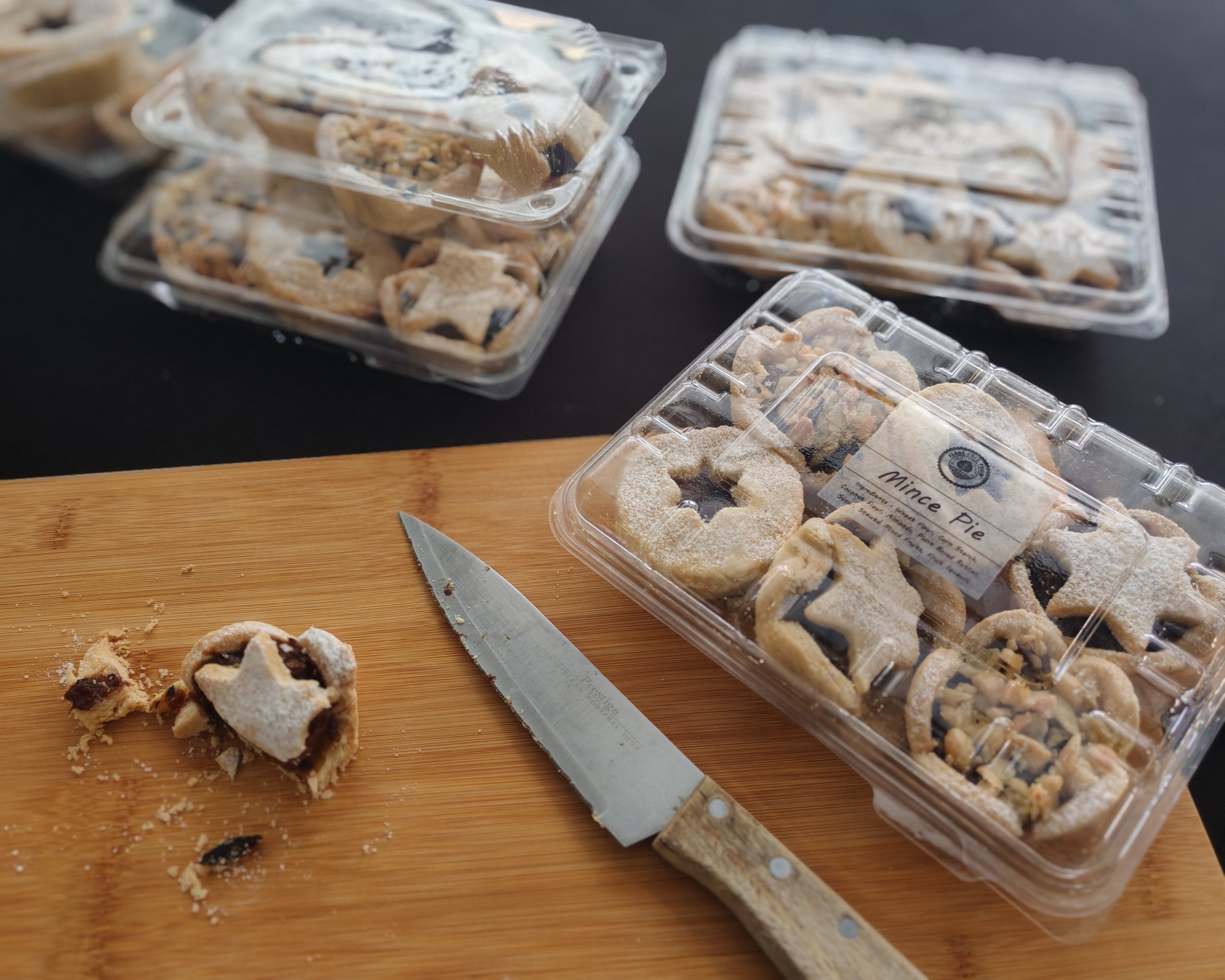 A tray of 4-6 Fruit Mince Pie. Fruit Mince filling, Dairy Free, Egg Free, Contains Cane Sugar, Seasonal